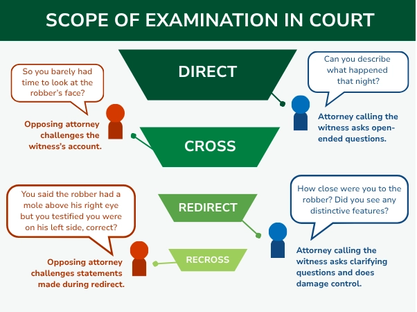 Below, we focus primarily on the last two types of questioning—redirect and re-cross. But to get there, we need to discuss the boundaries set in direct and cross-examination.